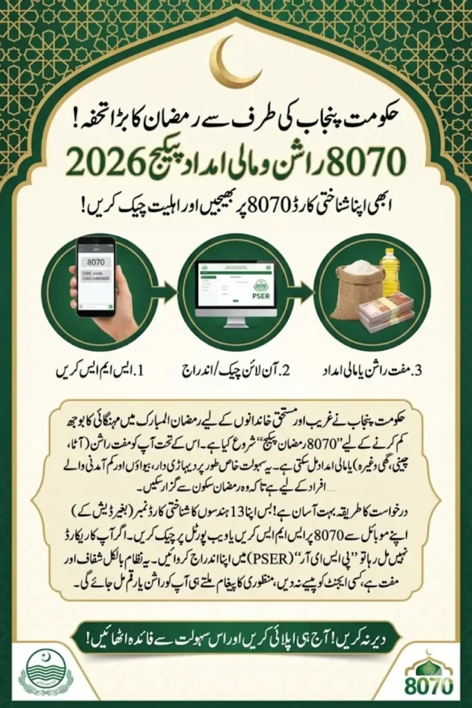 The 8070 Ramzan Package 2026 is a government initiative designed to provide financial and ration support to low-income families across Punjab. With the rising cost of living, this package aims to ease the burden of Ramadan expenses for deserving households. By using digital verification through SMS and the PSER portal, families can apply, check eligibility, and receive assistance without standing in long queues.