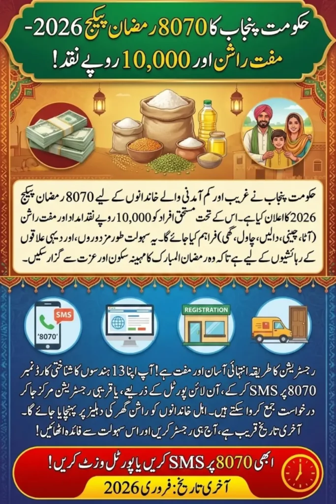 The Punjab government has launched the 8070 Ramzan Package 2026 to support low-income families during the holy month of Ramadan. With rising food prices and inflation, many households face difficulties managing daily meals and festive expenses. This program provides both financial aid and essential food items, ensuring families can celebrate Ramadan with dignity.