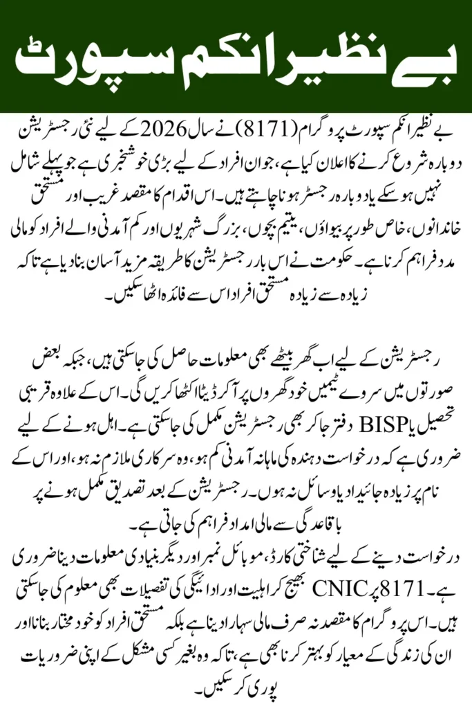 8171 BISP Good news for all those who are waiting for their registration. Who want to re-register themselves in the Benazir Income Support Program. Big news BISP has announced the registration for poor and rare people in 2026. They have decided to restore new eligible receipts BISP Senior Chairperson Dr. Amjad Saqib said.
