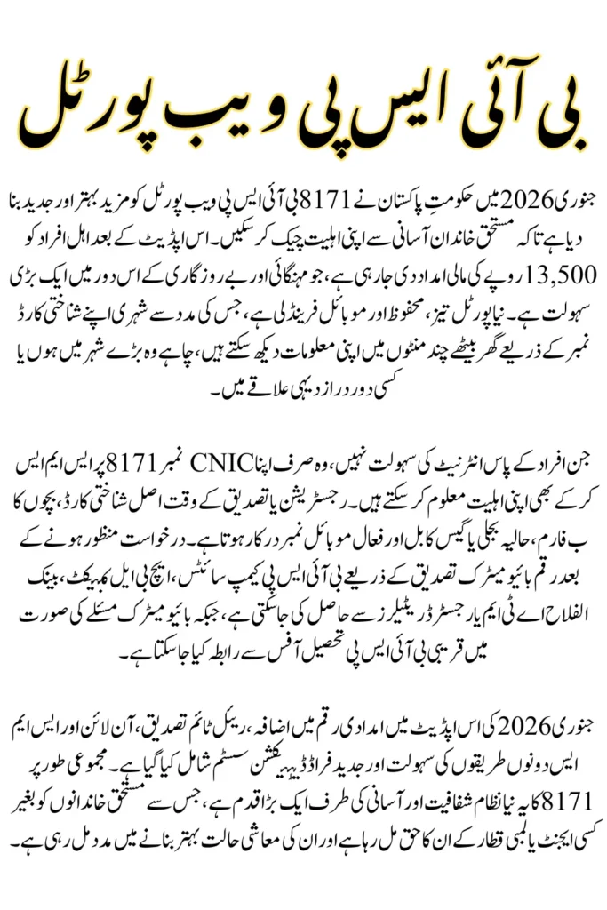 Government of Pakistan has updated the 8171 web portal of the BISP in February 2026 so that eligible families can easily check their eligibility. Now, eligible families are being given a financial assistance of Rs. 13,500, which is a great convenience in the face of rising inflation and unemployment. The new portal has been made fast, secure and simple so that ordinary citizens, especially those from remote areas, can easily check their eligibility through their CNIC number.