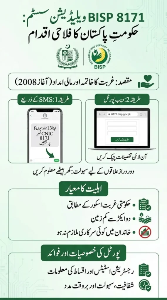 Government of Pakistan 8171 validation.bisp.gov.pk Providing poor, needy, and well-meaning families can track the progress of their applications by sending a text message with their CNIC numbers to 8171 and 8171 Validation.bisp.gov.pk.
