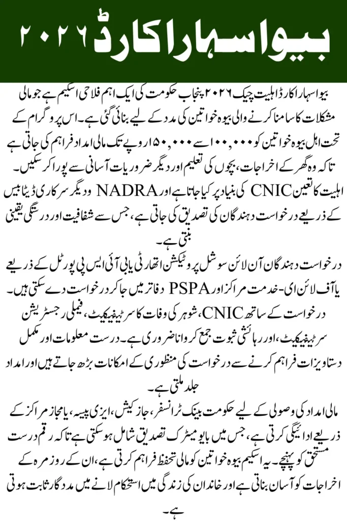 The Bewa Sahara Card Eligibility Check 2026 system helps ensure that financial assistance reaches widowed women who genuinely need support. Through CNIC-based verification, the government can quickly evaluate eligibility and provide financial aid to vulnerable households. The program offers assistance between Rs 100,000 and Rs 150,000, helping widows manage essential household expenses and improve their financial stability.