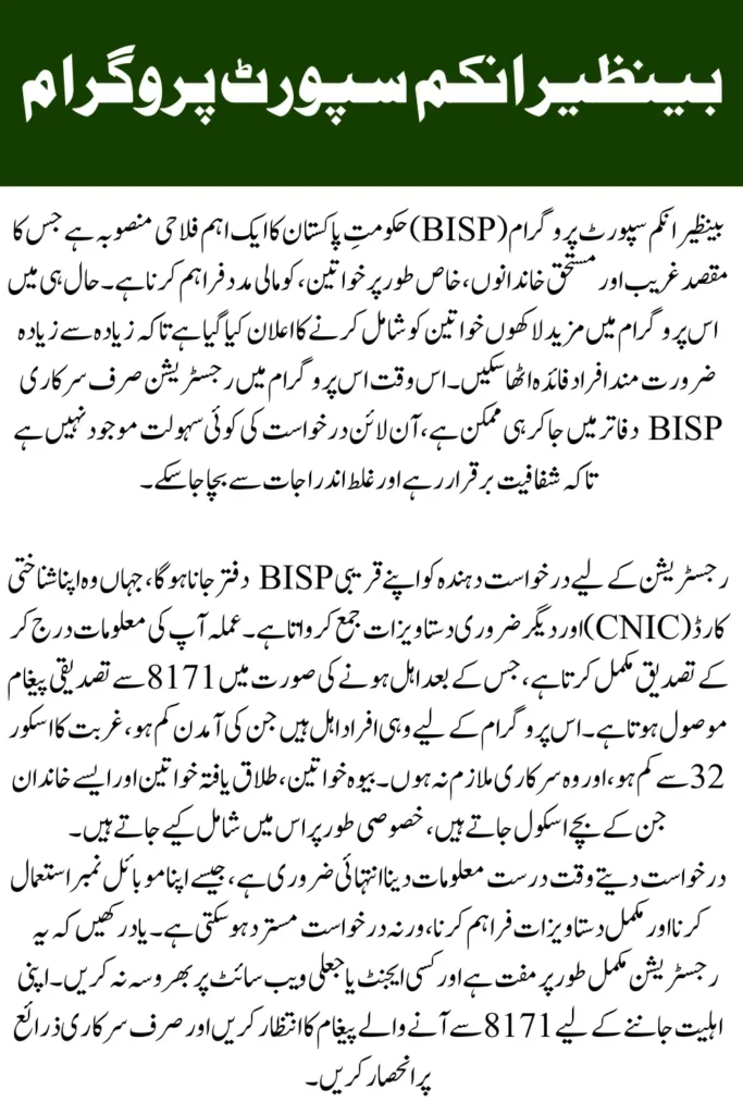 It is important to understand that BISP registration is currently available only through official BISP offices, and there is no online registration system at this time. Applicants must visit their nearest BISP office to complete the process.