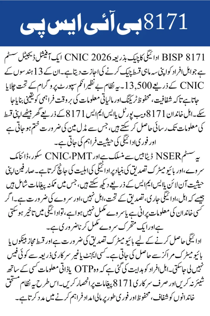 The BISP 8171 Payment Check by CNIC 2026 system provides a transparent, secure, and accessible method for beneficiaries to verify their Rs 13,500 quarterly installment. Through the official portal and SMS 8171 service, applicants can easily track eligibility, payment release, and survey updates.