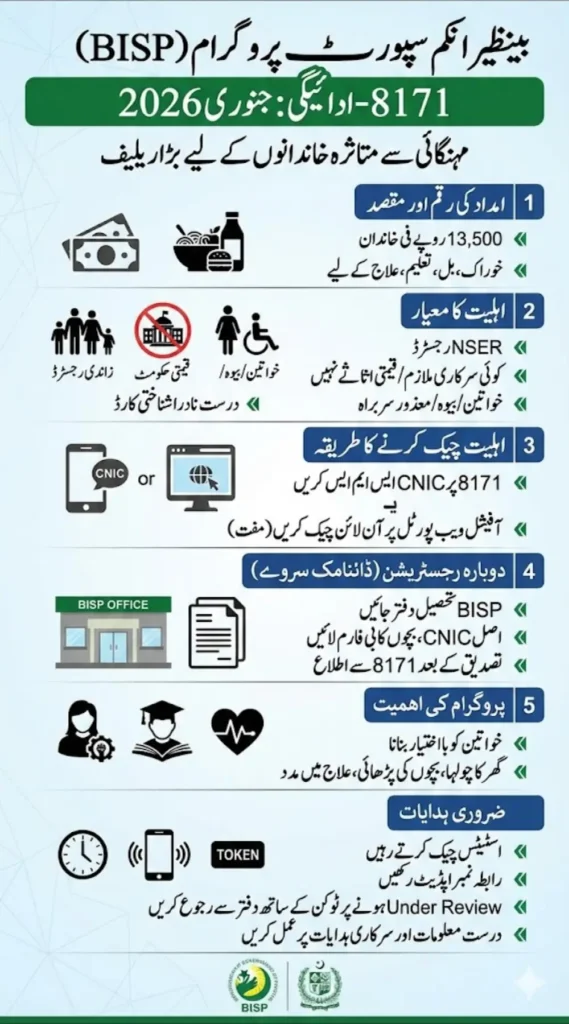 BISP 8171 January 2026 installment is a vital support system for Pakistan’s struggling families. Don’t miss your chance to receive this Rs. 13,500 assistance. Use the SMS service, check through the official portal, or visit the nearest BISP Tehsil Office to ensure your eligibility and secure your payment.