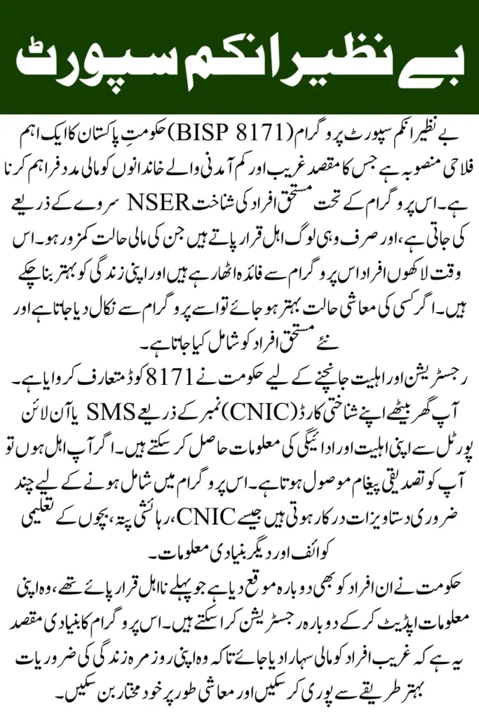 BISP 8171 پروگرام: بے نظیر انکم سپورٹ پروگرام پاکستان میں غریب لوگوں کو مالی امداد فراہم کرنے کے لیے ڈیزائن کیا گیا ایک پروگرام ہے۔ اس پروگرام کی منظوری حکومت پاکستان نے دی ہے۔ کیونکہ یہ ایک سرکاری پروگرام ہے، اس پروگرام میں جو بھی رقم دی جاتی ہے۔ انہیں حکومت پاکستان کی طرف سے دیا جاتا ہے۔ اگر آپ پاکستان کے رہائشی ہیں اور غریب ہیں، تو آپ اس پروگرام کے لیے اہل ہو سکتے ہیں۔