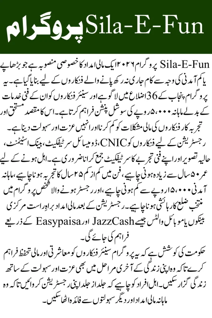 The Silla-E-Fun Program 2026 is a government initiative designed to provide financial assistance to senior artists who have served Pakistan for over 25 years in fields like film, TV, poetry, and journalism. With Rs. 5,000 monthly support, the program helps artists who cannot continue their work due to old age or low income, ensuring their basic needs are met.