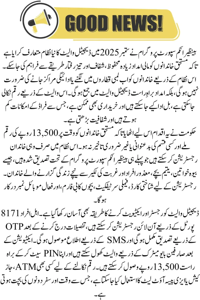 BISP Digital Wallet beneficiaries can easily withdraw their Rs. 13,500 through ATM and mobile wallet services from September 2025. After activation, funds can be accessed without long queues, making the process easy and secure.