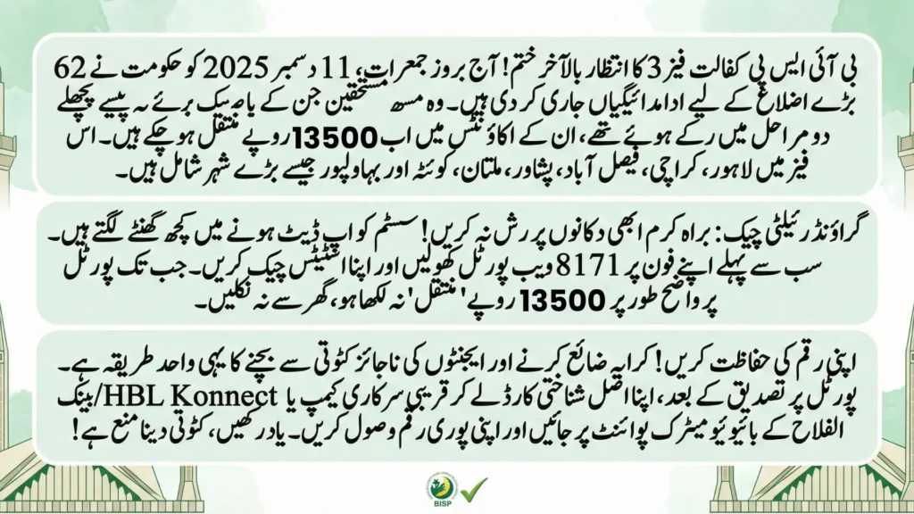 The long wait is finally over! BISP has officially pressed the green button for Phase 3 Kafaalat payments today, covering 62 major districts including Lahore, Karachi, Faisalabad, Peshawar, and Multan. If your money was stuck in the previous phases, it has likely landed in your account this morning.