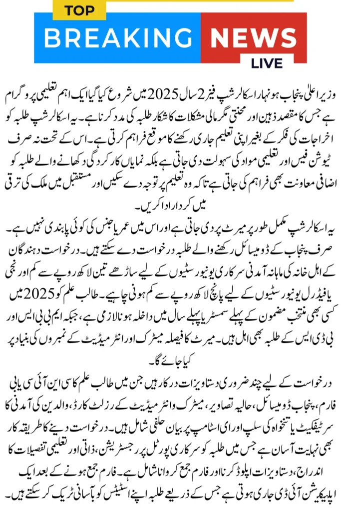 The CM Punjab Honhaar Scholarship Phase 2 is a major initiative launched in 2025 to help talented and hardworking students who are facing financial difficulties in their studies. This program ensures that deserving students can continue their education without the pressure of expenses. By offering financial assistance, it not only reduces stress but also encourages students to focus on their studies and achieve academic excellence.