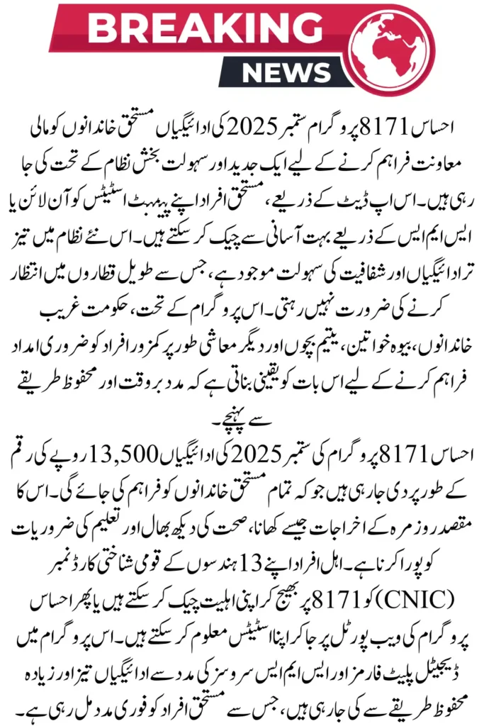 The Ehsaas 8171 program for September 2025 brings important updates for eligible families across Pakistan. The government continues its efforts to provide direct financial assistance to low-income households, ensuring that the aid reaches the needy in a faster and more transparent manner. Beneficiaries can now easily check their eligibility and payment status online or via SMS.
