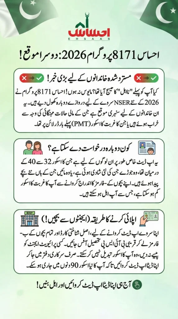 Ineligible by 8171 web portal? Don’t lose hope. The Ehsaas 8171 Program is reopening its doors for the 2026 NSER Survey, offering a second chance to families previously marked “Not Eligible.” This update specifically targets households whose financial situation has worsened or whose PMT score was borderline (32-40).