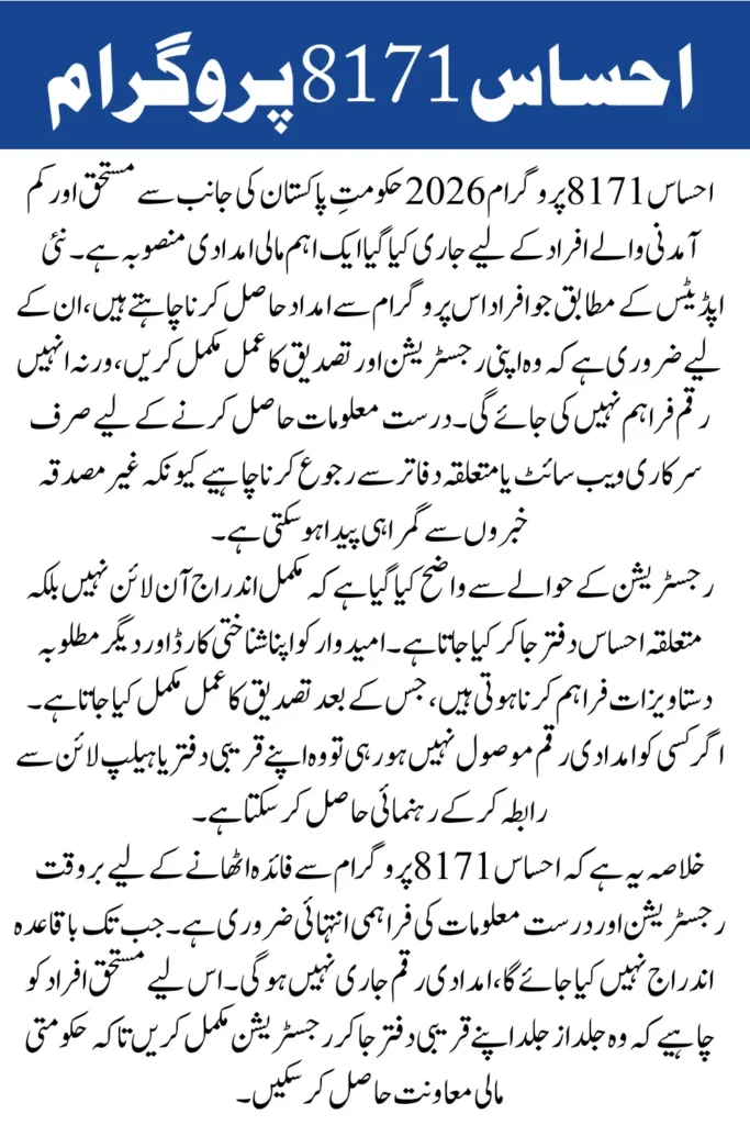 Ehsaas 8171 Program 2026: With Ehsaas Program New Update from Government of Pakistan, we are giving you information about Ehsaas Program and you have to read our article carefully and carefully to get this information. First of all, those people also want to get their new aid money in this program, if they have not yet register for the new portal verification, then they will not aid in this program.