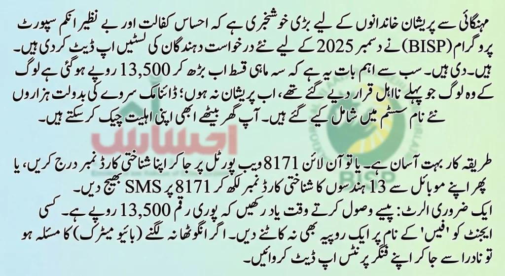 Bari Khushkhabri: The Ehsaas Kafalat Program and BISP systems have officially updated their beneficiary lists for December 2025. If you were previously waiting or marked ineligible, the new Dynamic Survey data might have cleared you for the increased quarterly stipend of Rs. 13,500.