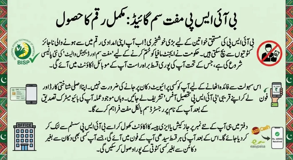 The Breaking Update: You do NOT need to buy a SIM from a shop. BISP is handing out special SIMs Free of Cost to eligible women. Once you have this SIM, your 10,500 installment will come directly into your mobile account (JazzCash/EasyPaisa). No agent, no deduction, full money!