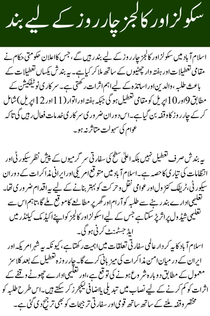 The local administration formally announced holidays on April 9 and April 10. This notification was issued by the Office of the District Magistrate, covering all areas within the Islamabad Capital Territory. Although the notification does not directly mention educational institutions, the implication is clear that academic activities will pause.