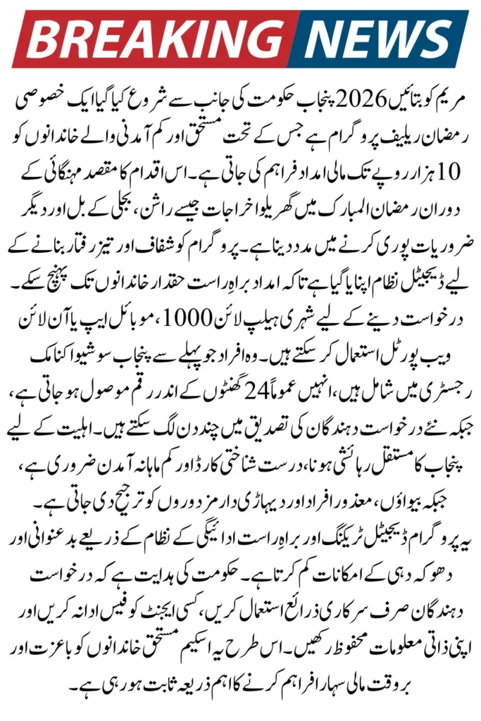 The Maryam Ko Bataye initiative 2026 is a financial relief program launched by Chief Minister Punjab Maryam Nawaz Sharif to support low-income families during Ramadan. This program aims to provide immediate financial assistance of up to Rs. 10,000 to deserving households facing financial difficulties. With rising expenses during the holy month, this initiative ensures families can manage their essential needs, including food, utilities, and daily necessities.