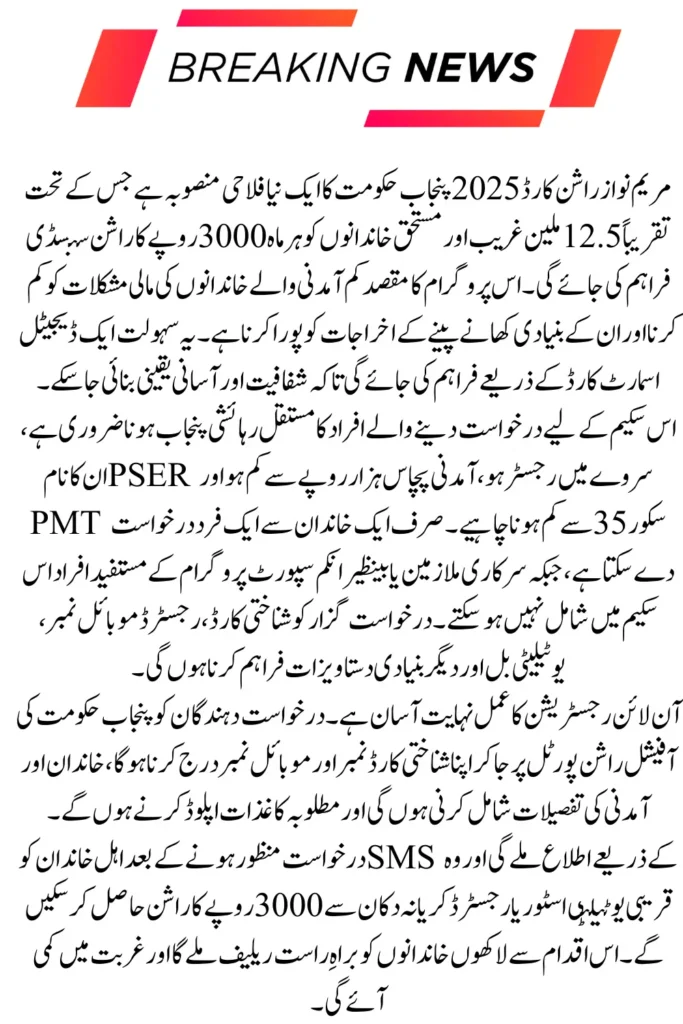 Maryam Nawaz Rashan Card 2025 is a new initiative by the Punjab government to provide monthly financial relief to low-income families. Under this program, approximately 12.5 million eligible families across Punjab will receive PKR 3,000 every month to meet their basic needs. The card aims to reduce the financial burden of disadvantaged families by offering continuous support.