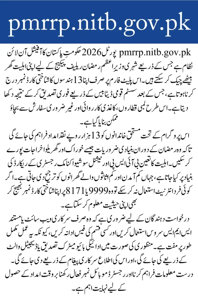 The pmrrp.nitb.gov.pk Portal 2026 provides a fast, transparent, and secure way to verify eligibility for the Prime Minister Ramzan Relief Package of Rs 13,000. Through CNIC-based screening, SMS verification options, and digital payments, the system ensures that deserving families receive timely assistance during Ramadan.