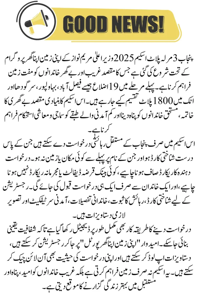 Punjab 3 Marla Plot Scheme 2025 is a revolutionary step of Chief Minister Maryam Nawaz which provides free land to poor and homeless families and provides them with sustainable housing. This scheme will not only reduce poverty and homelessness but will also ensure social equality and a better life for future generations. Through this digital and transparent system, only deserving families will be able to benefit from this facility, which is an important step towards a major social change.