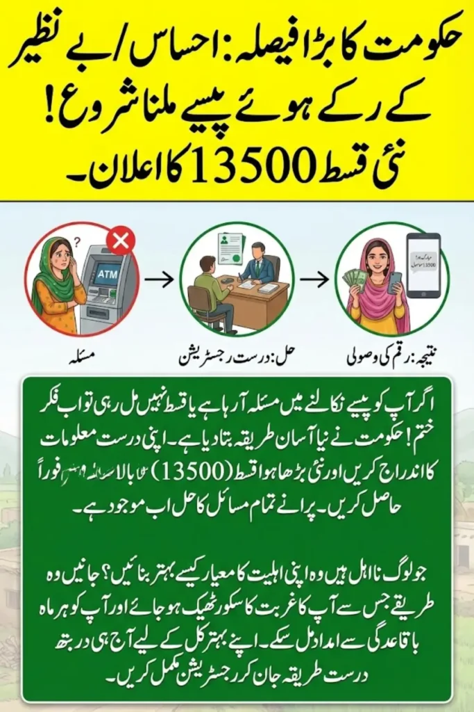 احساس پروگرام کے تحت مستحق اور کم آمدنی والے خاندانوں کو مالی امداد اور دیگر سہولیات فراہم کی جاتی ہیں۔ اکثر افراد کو ادائیگی میں مشکلات اس لیے پیش آتی ہیں کیونکہ وہ مکمل اور درست معلومات فراہم نہیں کرتے۔ درست رجسٹریشن اور مکمل معلومات دینے کے بعد ہی ماہانہ مالی امداد جیسے 13,500 روپے حاصل کیے جا سکتے ہیں۔ حکومت پاکستان نے اس سلسلے میں بہترین اقدامات کیے ہیں تاکہ ہر مستحق شخص آسانی سے اپنی رقم اور سہولیات حاصل کر سکے۔