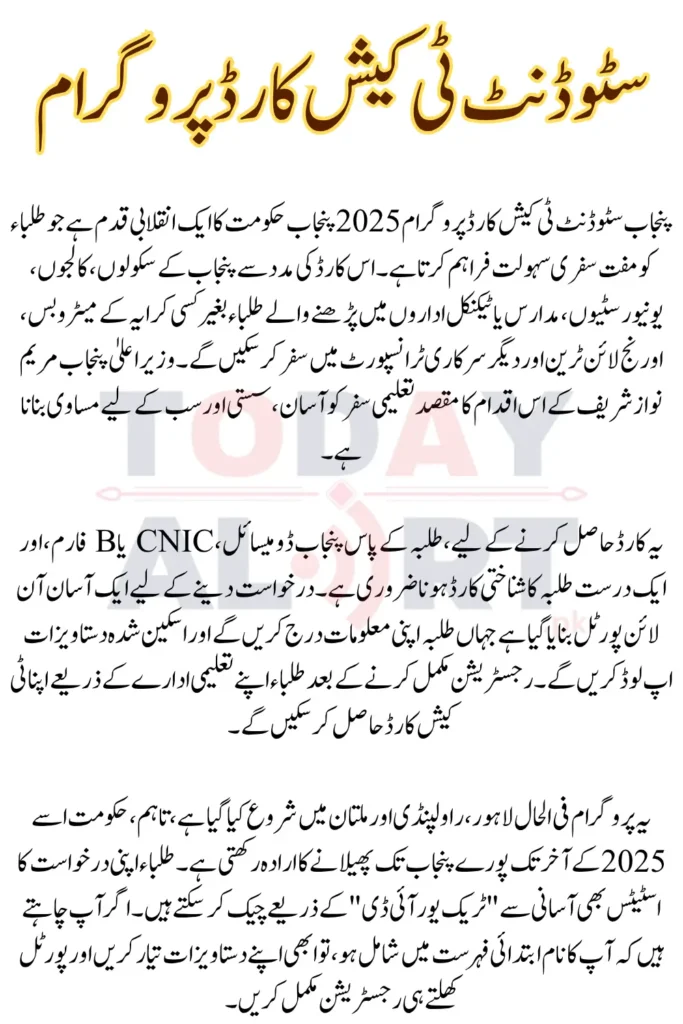 Punjab Student T-Cash Card Program 2025 is a revolutionary step by the Punjab government that provides free travel facility to students. With the help of this card, students studying in schools, colleges, universities, madrasas or technical institutes of Punjab will be able to travel in Metro Bus, Orange Line Train and other government transport without any fare. This initiative by Punjab Chief Minister Maryam Nawaz Sharif aims to make educational travel easy, affordable and equal for all.