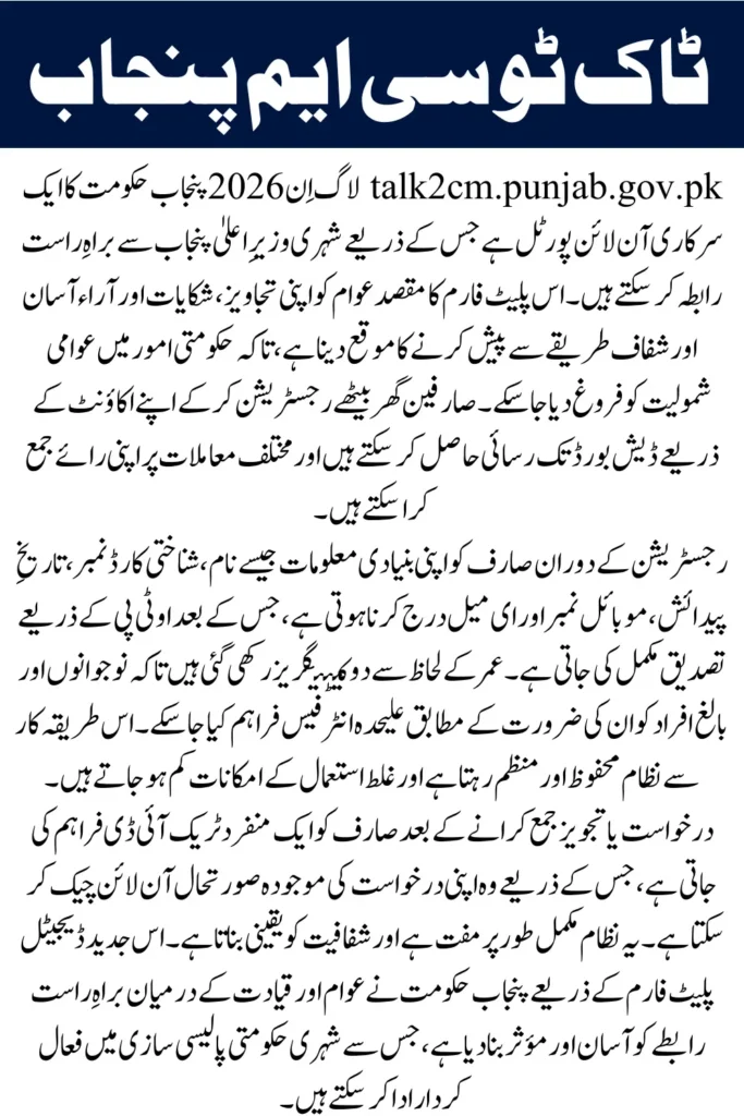The talk2cm.punjab.gov.pk Login 2026 is the official online access point for citizens who want to communicate directly with the Chief Minister of Punjab. This digital platform allows users to share ideas, suggestions, and complaints without visiting any government office. It has been designed to promote transparency, accountability, and public participation in governance across Punjab.